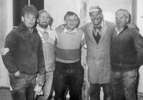 Es wurden Wände herausgerissen und eine Zwischenwand neu errichtet. Ein Stützträger neu aufgesetzt, er bewerkstelligte die benötige Raumgröße. Die gesamte Decke wurde hierfür mit Holzstempeln abgefangen. Einige Tonnen Bruchsteine und Abbruchmaterial galt es zu entsorgen. Beim Abriss der Zwischendecke, die aus Gerstenspreumörtel und Backsteinresten bestand, haben dichte Staubwolken die Arbeiten sehr erschwert.